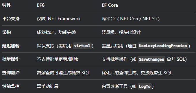 性能方面,EFCore通常比EF6更好,因为它的设计更现代化,比如查询生成更高效,延迟加载在EFCore中是可选且需要显式开启,减少了不必要的加载。另外,EFCore支持更高效的批量操作,比如一次保存多个更改时,EFCore可以生成批量SQL语句,而EF6通常是逐条执行。